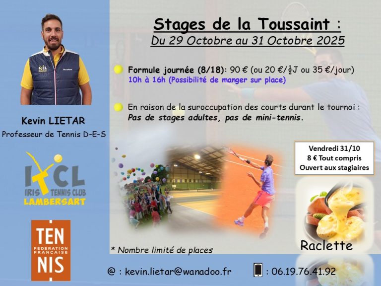 Durant toutes les vacances scolaires, enfants et adultes peuvent participer à des stages qui sont également ouverts aux personnes extérieures au Iris Tennis Club, club de tennis à Lambersart.